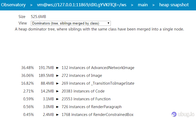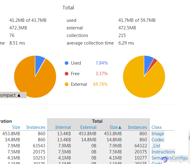 AdvancedNetworkImage 和 Image 的占用非常高。但是也不至于这么多,同时 _TransitionToImageState 也不应该占用这么多,猜测是 TransitionToImage 组件可能多次缓存了图片数据甚至可能有内存泄露,导致内存占用被放大了。有了猜想去检验一下,将这个组件替换成纯图片组件