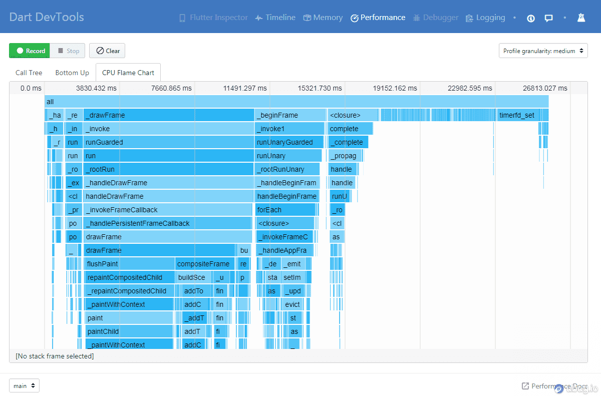 流畅度是眼睛看到的视觉,不是一个能明确报错行数的 bug,所以需要一个指标来看到底哪里导致的渲染问题。Dart DevTool 提供诸如性能分析、内存占用以及显示运行火焰图等功能。