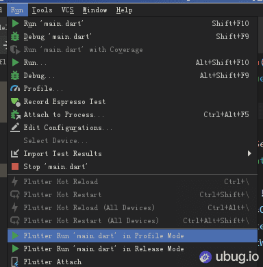 - 在 Android Studio 中使用 Run > Flutter Run main.dart in Profile Mode 选项