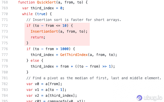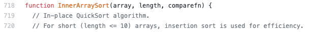 上面明确说了小于等于 10 的数组用插入排序,不然使用快速排序: