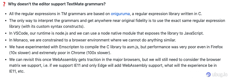 Textmate 语法解析依赖的 Oniguruma 是一个 C 语言下的解析功能,VSCode 可以使用 node 环境来调用原生的模块,但是在 web 环境下无法实现,即使通过 asm.js 转换后,性能依然会有 100-1000 倍的损失(16年9月的说明,目前未测试),而且 IE 不支持~~~而官方说的 asm.js 的方式的缺点,我认为都是可以接受的,所以仍然想尝试使用 textmate。